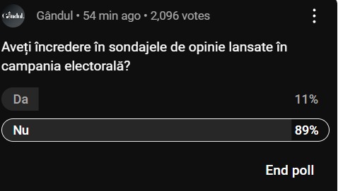 „Aveți încredere în sondajele de opinie lansate în campania electorală?”– Aceasta a fost întrebarea propusă la poll-ul emisiunii „Marius Tucă Show” de joi, 14 noiembrie 2024, fiind propuse două variante de răspuns.