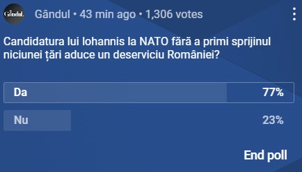 „Candidatura lui Klaus Iohannis la NATO, fără sprijinul niciunei țări, aduce un deserviciu Românei?”. Află ce au răspuns telespectatorii emisiunii „Marius Tucă Show” de joi, 11 aprilie, la poll-ul acestei ediții.