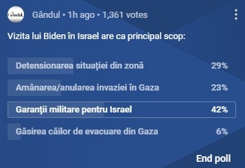 În această seară, telespectatorii emisiunii „Marius Tucă Show” au fost întrebați „care cred că e scopul principal al vizitei președintelui american Joe Biden în Israel”, fiind propuse trei variante de răspuns.
