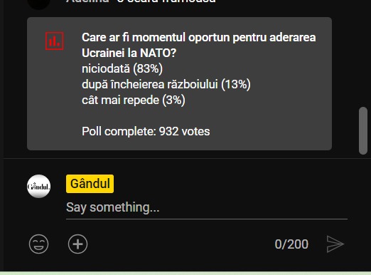 La poll-ul emisiunii „Marius Tucă Show” de joi, 22 iunie, au existat trei variante de răspuns. Întrebarea a fost următoarea: „Care ar fi momentul oportun pentru aderarea Ucrainei la NATO?”