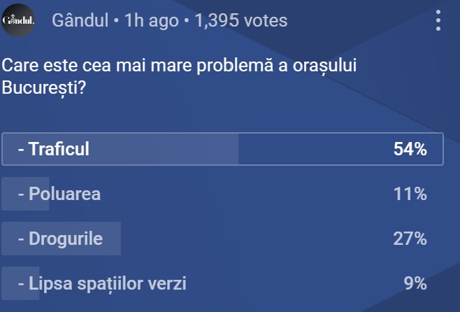 La sondajul din această seară, propus la emisiunea Marius Tucă Show, întrebarea a fost următoarea: „Care este cea mai mare problemă a orașului București?”.