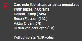 Află cum au răspuns telespectatorii emisiunii Marius Tucă Show de joi, 14 martie, la întrebarea poll-ului: „Care este liderul care ar putea negocia cu Putin pacea în Ucraina?”. Au fost propuse patru variante de răspuns.