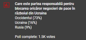 „Care este partea responsabilă pentru blocarea oricăror negocieri de pace în războiul din Ucraina?”. Au existat trei variante de răspuns, pentru această întrebare de la poll-ul emisiunii „Marius Tucă Show” din această seară.