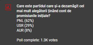 Întrebarea poll-ului de la emisiunea „Marius Tucă Show” de joi, 11 ianuarie, a fost una de ordin politic: „Care este partidul care și-a dezamăgit cel mai mult alegătorii, ținând cont de promisiunile inițiale?”.