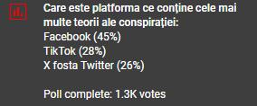 La poll-ul din această seară, telespectaorii emisiunii „Marius Tucă Show” au fost întrebați „care este platforma ce conține cele mai multe teorii ale conspirației…”. Ei au avut la dispoziție trei variante de răspuns.
