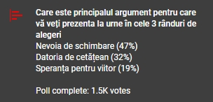 „Care este principalul argument pentru care vă veți prezenta la urne în cele trei rânduri de alegeri?”. Aceasta a fost întrebarea propusă la poll-ul emisiunii „Marius Tucă Show” de miercuri, 23 octombrie 2024, fiind propuse trei variante de răspuns.