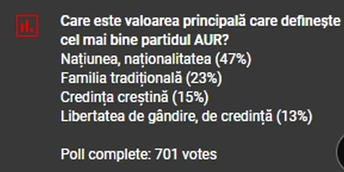 Pe 28 septembrie, în seara în care la „Marius Tucă Show” a fost invitat liderul AUR, George Simion, întrebarea de la poll a avut legătură cu acest partid: „Care este valoarea principală care definește cel mai bine partidul AUR?”. Iar telespectatorii au avut la dispoziție patru variante de răspuns.