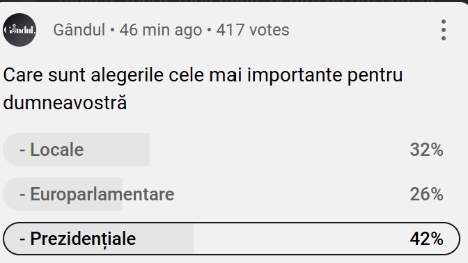 Telespectatorii emisiunii „Marius Tucă Show” au fost întrebați, joi seară, „Care sunt alegerile cele mai importante pentru dumneavoastră?”. Au fost oferite trei variante de răspunsuri.