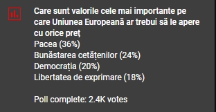 Iată întrebarea din aceasta seară, de la poll-ul emisiunii „Marius Tucă Show”: „Care sunt valorile cele mai importante pe care Uniunea Europeană ar trebui să le apere cu orice preț?”. Au existat patru variante de răspuns.