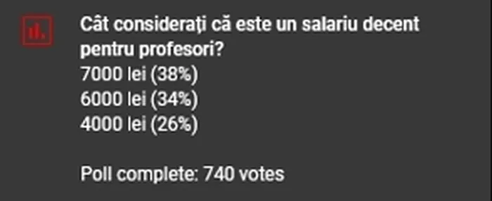 Întrebarea de la poll-ul emisiunii „Marius Tucă Show” de luni, 22 mai, a fost următoarea: „Cât considerați că este un salariu decent pentru profesori?”. Iar telespectatorii au avut trei variante de răspuns.