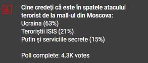 Telespectatorii emisiunii „Marius Tucă Show” au avut trei variante de răspuns la întrebarea poll-ului din această seară: „Cine credeți că se află în spatele atacului terorist de la mall-ul din Moscova?”.