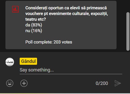„Considerați oportun ca elevii să primească vouchere pentru evenimente culturale, expoziții, teatru etc?”. Aceasta a fost întrebarea la care au putut să răspundă telespectatorii, la poll-ul emisiunii „Marius Tucă Show” de marți, 9 mai.