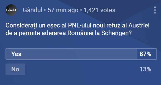 „Considerați un eșec al PNL-ului noul refuz al Austriei de a permite aderarea României la Schengen?”. Aceasta a fost întrebarea poll-ului de la emisiunea „Marius Tucă Show” de joi, 7 martie. Iar cei mai mulți telespectatori au răspuns afirmativ.