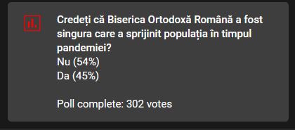 Peste 50% dintre telespectatori au fost de părere că nu, iar 45% cred că Biserica Ortodoxă Română a fost singura care a sprijinit populația în timpul pandemiei.