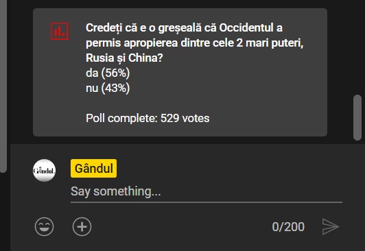 Iată întrebarea propusă la poll-ul emisiunii „Marius Tucă Show” de miercuri, 29 martie: „Credeți că este o greșeală că Occidentul a permis apropierea dintre cele două mari puteri, Rusia și China?”.
