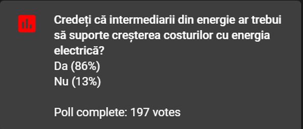 Ei bine, din totalul voturilor, varianta pozitivă a fost majoritară. 86% dintre useri au spus că intermediarii din energie ar trebui să suporte creșterea costurilor cu energia electrică. Evident, restul de 13 procente nu acceptă această variantă.