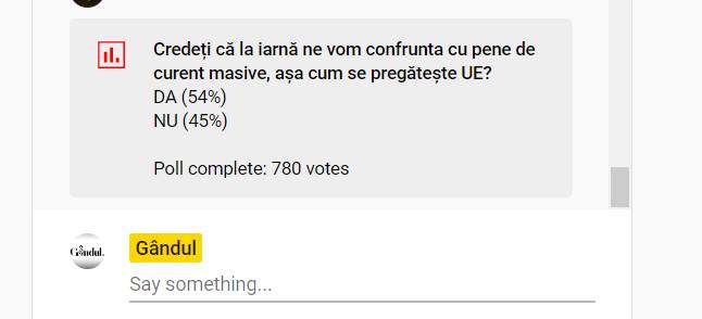 Rezultatul a fost destul de strâns, pentru că doar 54% au răspuns afirmativ, iar 45% dintre repondenți cred că nu ne vom confrunta cu pene de curent masive la iarnă.