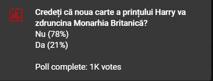 78% dintre cei care au răspun nu cred în această variantă și doar 21% spun că noua carte a prințului Harry va zdruncina Monarhia Britanică.