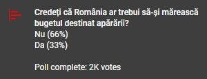 Întrebarea poll-ului de miercuri seară, de la emisiunea „Marius Tucă Show”, a fost următoarea: „Credeți că România ar trebui să-și mărească bugetul destinat apărării?” Majoritatea respondenților (66%) a apreciat că nu, în timp ce 33% sunt de părere că ar trebui.