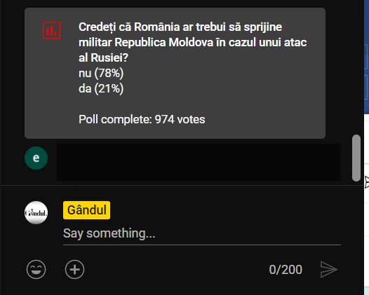 Poll-ul emisiunii „Marius Tucă Show” de joi, 1 iunie, a propus următoarea întrebare: „Credeți că România ar gtrebui să sprijine militar Republica Moldova în cazul unui atac al Rusiei?”