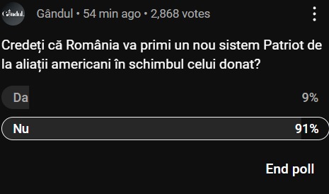 „Credeți că România va primi un nou sistem Patriot de la aliații americani, în schimbul celui donat?”. Iată cum au răspuns telespectatorii la întrebarea propusă la poll-ul emisiunii „Marius Tucă Show” de luni, 24 iunie: