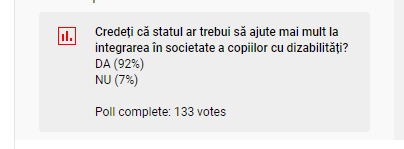 Răspunsul pozitiv a fost, de departe, unul covârșitor. 92%! Doar 7 % dintre telespectatori au spus că statul nu ar trebui să ajute mai mult la integrarea în societate a copiilor cu dizabilități.