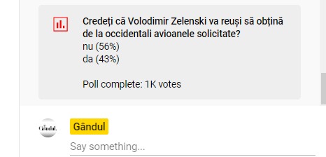 56% au spus că NU, iar 43% cred că Volodimir Zelenski va reuși, totuși, să obțină de la occidentali avioanele solicitate.
