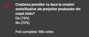 „Creșterea pensiilor va duce la creșteri semnificative ale prețurilor produselor din coșul zilnic?”. Iată ce au răspuns telespectatorii emisiunii „Marius Tucă Show”, la întrebarea poll-ului din această seară: