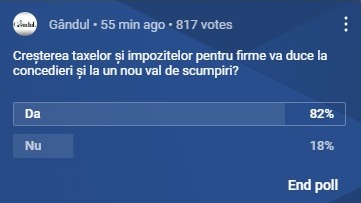 Întrebarea serii la poll-ul emisiunii Marius Tucă Show, ediția de marți, 19 septembrie, a fost următoarea: „Creșterea taxelor și impozitelor pentru firme va duce la concedieri și la un nou val de scumpiri?”.