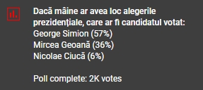 Iată întrebarea poll-ului, din această seară, de la emisiunea Marius Tucă Show: „Dacă mâine ar avea loc alegerile prezidențiale, care ar fi candidatul votat?”. Au fost propuse trei opțiuni.