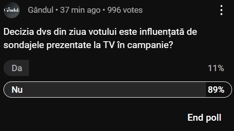 La poll-ul emisiunii „Marius Tucă Show” din această seară, telespectatorii au fost chestionați cu privire la modul în care le-ar putea fi influențată decizia de vot. „Decizia dumneavoastră din ziua votului este influențată de sondajele prezentate la TV în campanie?”, este întrebarea adresată publicului.