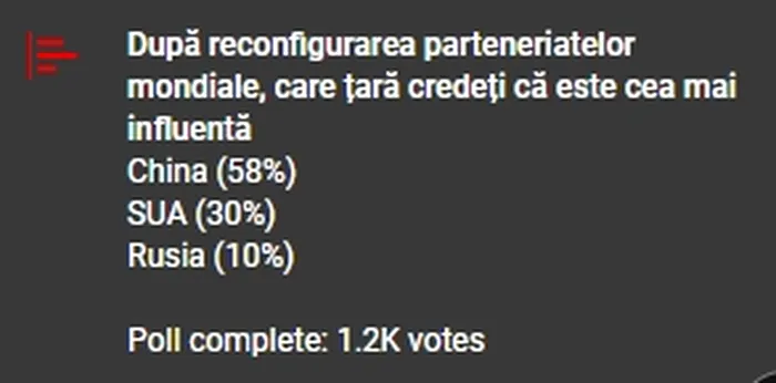 Poll Marius Tucă Show. Întrebarea ediției a fost: „După reconfigurarea parteneriatelor mondiale, care țară credeți că este cea mai influentă ?”