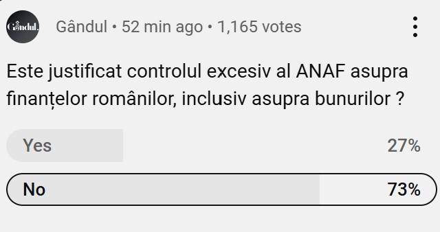 Telespectatorii emisiunii „Marius Tucă Show” au fost întrebați, în cadrul poll-ului din această seară, dacă „este justificat controlul excesiv al ANAF asupra finanțelor românilor, inclusiv asupra bunurilor”. Cei mai mulți telespectatori au spus că nu.
