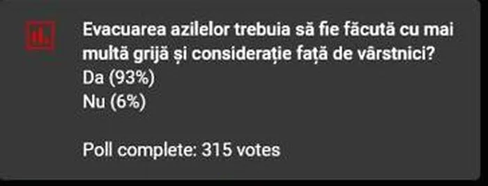 Cei mai mulți telespectatori, care au răspuns la poll-ul emisiunii „Marius Tucă Show” de marți, 12 iulie, au considerat că evacuarea azilelor trebuia să fie făcută cu mai multă grijă și considerație față de vârstnici.