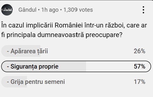 „În cazul implicării României într-un război, care ar fi principala dumneavoastră preocupare?”. Aceasta a fost întrebarea serii, la poll-ul emisiunii „Marius Tucă Show” de luni, 23 septembrie.