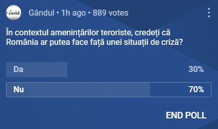 „În contextul amenințărilor teroriste, credeți că România ar putea face față unei situații de criză?”. Aceasta a fost întrebarea poll-ului emisiunii „Marius Tucă Show”, de joi, 21 decembrie.