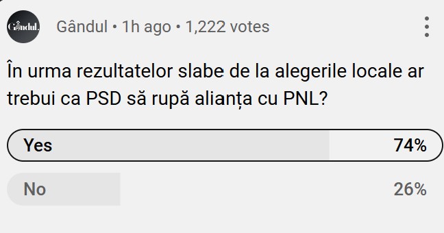 „În urma rezultatelor slabe de la alegerile locale, PSD ar trebui să rupă alianța cu PNL?”. Aceasta a fost întrebarea serii, la poll-ul emisiunii „Marius Tucă Show”.