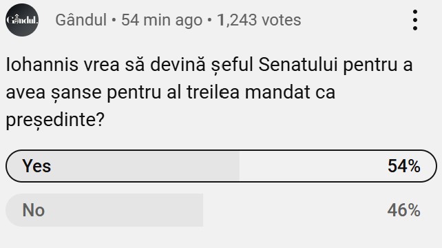 Poll Marius Tucă Show. Întrebarea ediției a fost: „Iohannis vrea să devină șeful Senatului pentru a avea șanse pentru al treilea mandat ca președinte?”