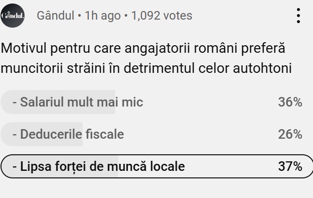Cei mai mulți spectatori au votat „lipsa forței de muncă locale (37%), la mică distanță de cei care au votat „salariul mult mai mic” (36%).