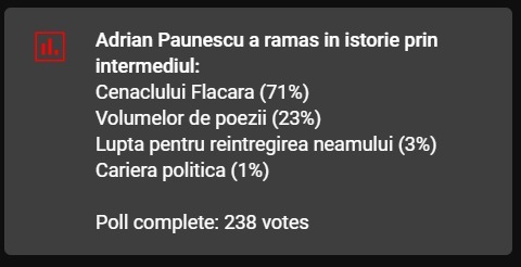 În seara în care la „Marius Tucă Show” au fost invitați copiii poetului Adrian Păunescu, Ana-Maria și Andrei, întrebarea de la poll a fost următoarea: „Prin ce a rămas în istorie poetul Adrian Păunescu?”. Au fost propuse patru variante de răspuns…