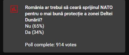 „România ar trebui să ceară sprijinul NATO pentru o mai bună protecție a zonei Deltei Dunării?”. Aceasta a fost întrebarea poll-ului emisiunii „Marius Tucă Show” de miercuri, 6 septembrie.