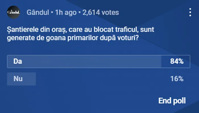 Telespectatorii emisiunii „Marius Tucă Show” au putut răspunde la următoarea întrebare, în cadrul poll-ului din această seară: „Șantierele din oraș, care au blocat traficul, sunt generate de goana primarilor după voturi?”.