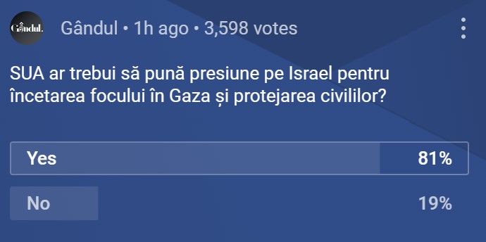 Telespectatorii emisiunii Marius Tucă Show de luni, 1 aprilie, au fost întrebați dacă „SUA ar trebui să pună presiune pe Israel pentru încetarea focului în Gaza și protejarea civililor”, iar cei mai mulți dintre ei au considerat că da.