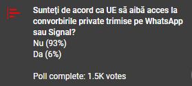 La întrebarea „Sunteți de acord ca UE să aibă acces la convorbirile private ale europenilor trimise pe WhatsApp sau Signal”, 93% dintre urmăritorii emisiunii lui Marius Tucă au răspuns, desigur, „NU” și doar 6% au fost de acord ca UE să le „cotrobăie” prin conversații.