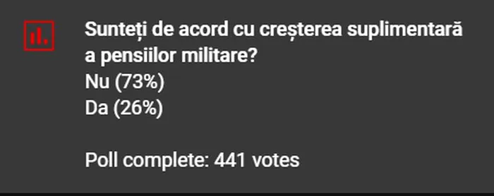 Cei mai mulți telespectatori, 73%, au spus că DA și doar 26% nu au fost de acord cu creșterea suplimentară a pensiilor militare.