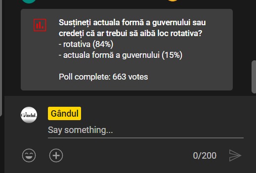 Întrebarea de la poll-ul emisiunii „Marius Tucă Show” de joi, 18 mai, a fost următoarea: „Susțineți actuala formă a guvernului sau credeți că ar trebui să aibă loc rotativa?”. Iar telespectatorii au avut două variante de răspuns.