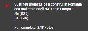 Întrebarea poll-ului emisiunii „Marius Tucă Show” de joi, 21 martie, a fost următoarea: „Susțineți proiectul de a construi în România cea mai mare bază NATO din Europa?”.