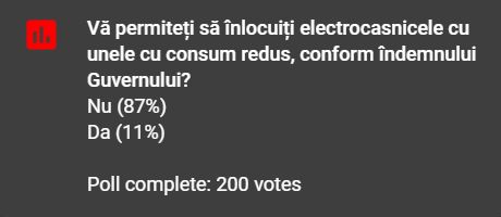 Așa cum era de așteptat, din cauza condițiilor economice din această perioadă, cei mai mulți au oferit un răspuns negativ. Astfel, 87% dintre repondenți au afirmat că nu își permit să înlocuiască electrocasnicele din casă.