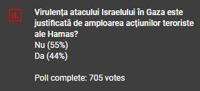 Ultima ediție din această săptămâna a emisiunii „Marius Tucă Show” a propus următoarea întrebare, la poll: „Virulența atacului Israelului în Gaza este justificată de amploarea acțiunilor teroriste ale Hamas?”.