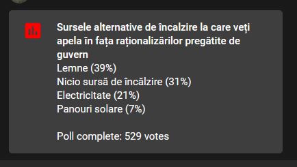 De asemenea, din totalul celor 529 de voturi, 21% dintre urmăritori au „mizat” pe electricitate și doar 7% au declarat că vor folosi panouri solare.